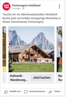 Insgesamt konnten 1’043’268 Impressionen und 13’335 Link-Klicks (auf shop.heidiland.com) erzielt werden. Auch die Anzahl der Buchungen stieg signifikant an. Zudem haben wir wertvolle Erkenntnisse über die Interessen unserer Zielgruppe gewonnen. Sie helfen uns, zukünftige Kampagnen noch effizienter zu gestalten. So wurde die Kampagne auf die Wintersaison 2023/24 hin optimiert und die Kosten pro Link-Klick konnten deutlich reduziert werden. Aufgrund der guten Resultate und der langfristigen Sichtbarkeit der Erlebnisse wird dieses Kampagnenkonzept fortgeführt.