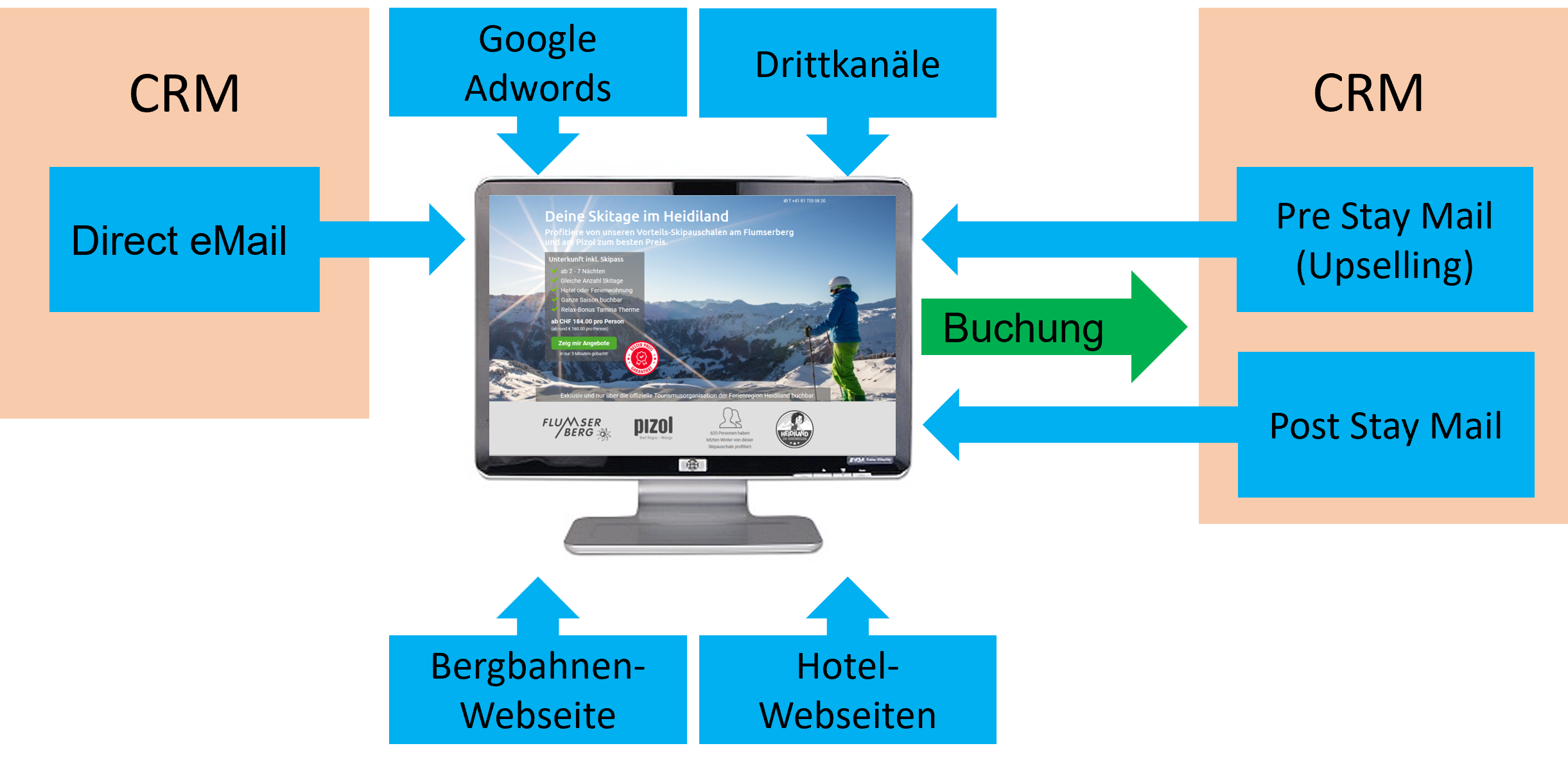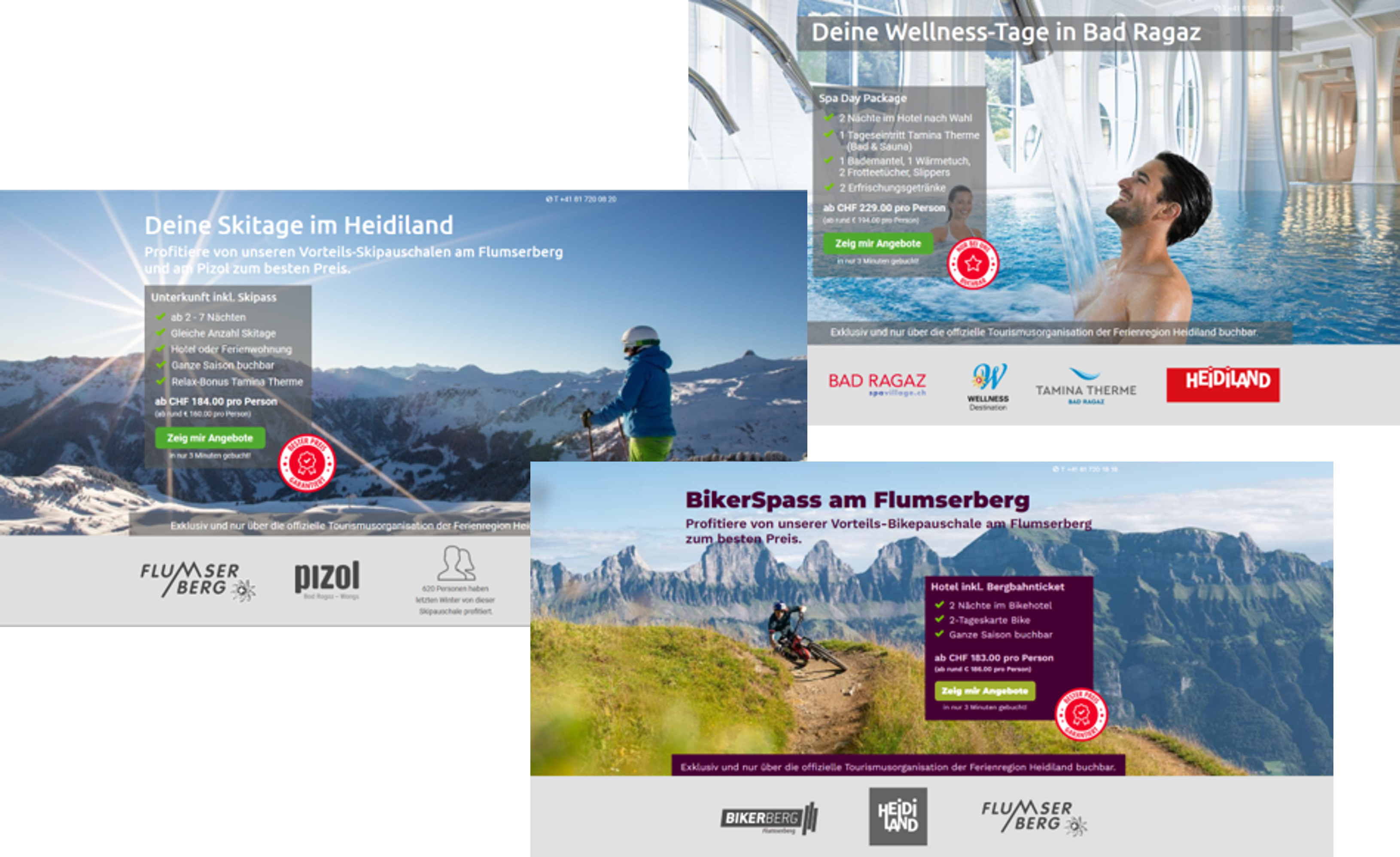 Für die drei Pauschalen standen verkaufsorientierte Landingpages zur Verfügung. Die Bewerbung erfolgte hauptsächlich durch Google-Ads-Kampagnen. Dies führte zu über 230’000 Impressionen und rund 30’000 Klicks, was schlussendlich zu zahlreichen direkten und indirekten Buchungen führte. Wichtig für die Performance der Kampagne war auch die Verlinkung der Landingpages bei allen beteiligten Unterkünften und Anbietern.